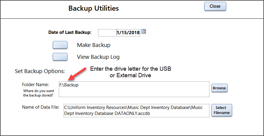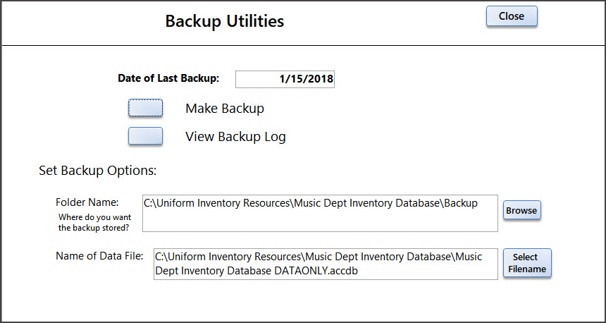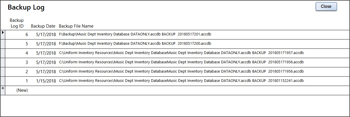 (Remember the Music Dept / Uniform Inventory Database xx.accdb file is just the forms and reports. A backup of this file is made at the time of the installation. If you can't find the Database xx file, contact us and we will supply it to you.)