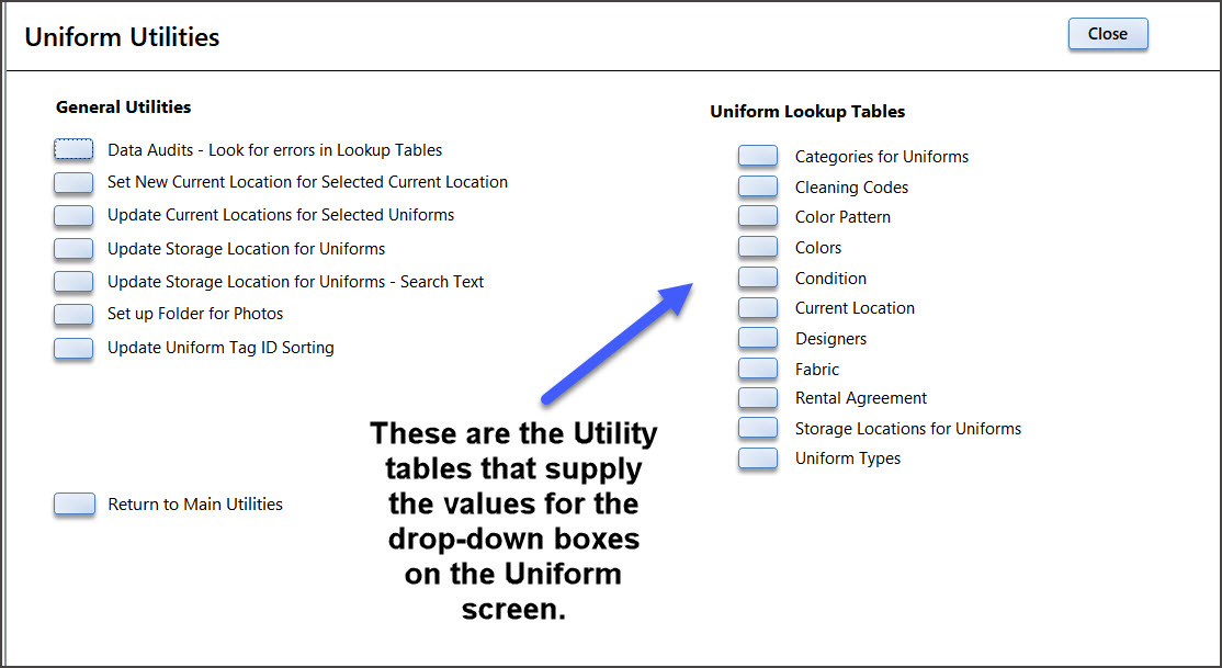 To update a Lookup Table go to the Utilities Menu for the module you wish to update and find the table you wish to update. Each module (Uniforms, Instruments, etc) have their own list of lookup tables to update.