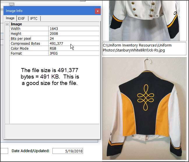 You can see that the file size of the photo is 491,377 bytes = 491 kb. This is a good size for the file. Remember you would like your photos to be 200 - 700 kb in size.