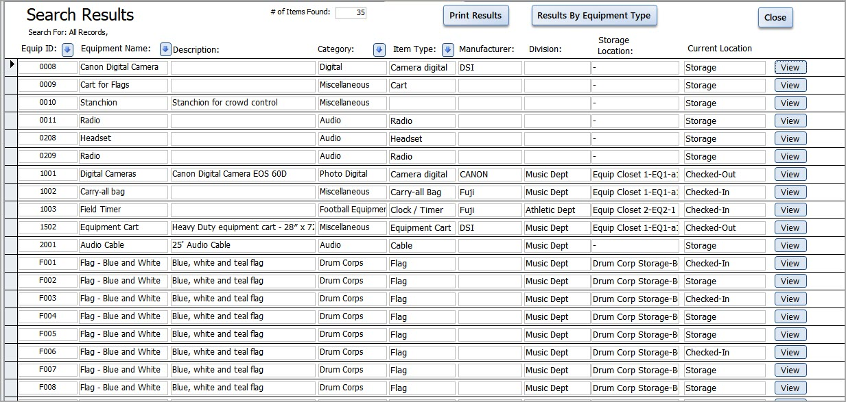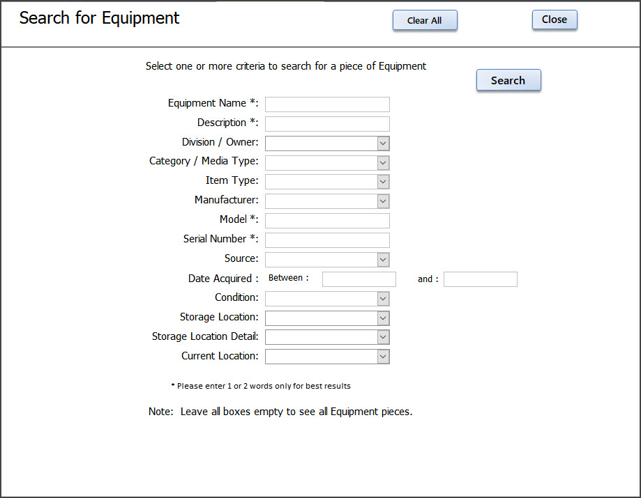 You may search for equipment on one or more of these fields. The dropdown boxes all show values from the Look up tables.