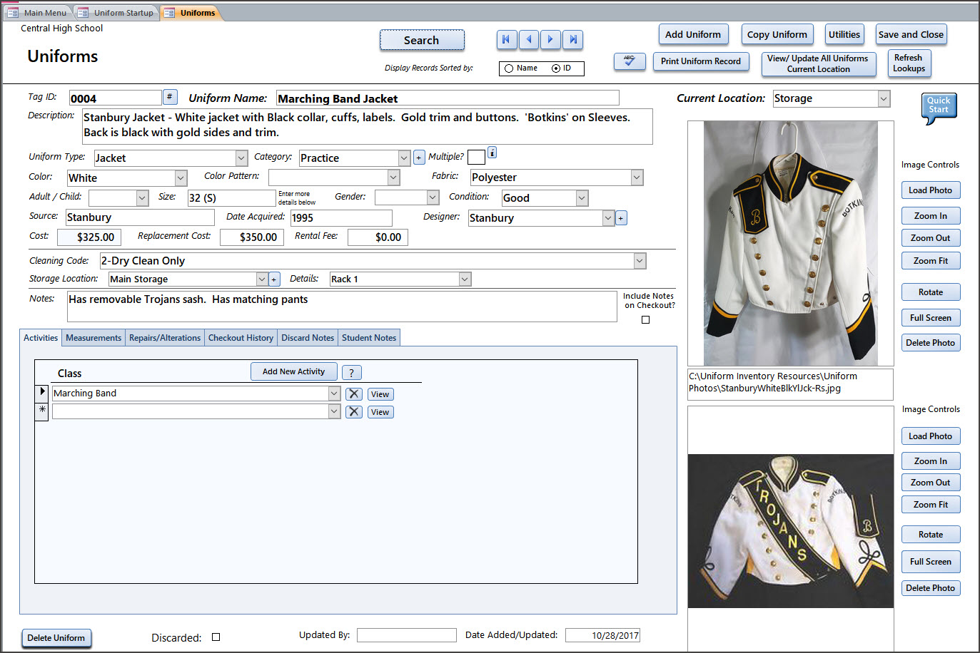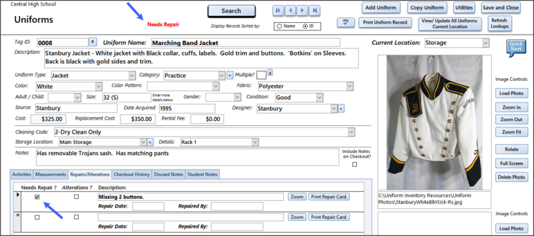 The Uniform Screen has many fields to describe the uniform plus 2 photos.
