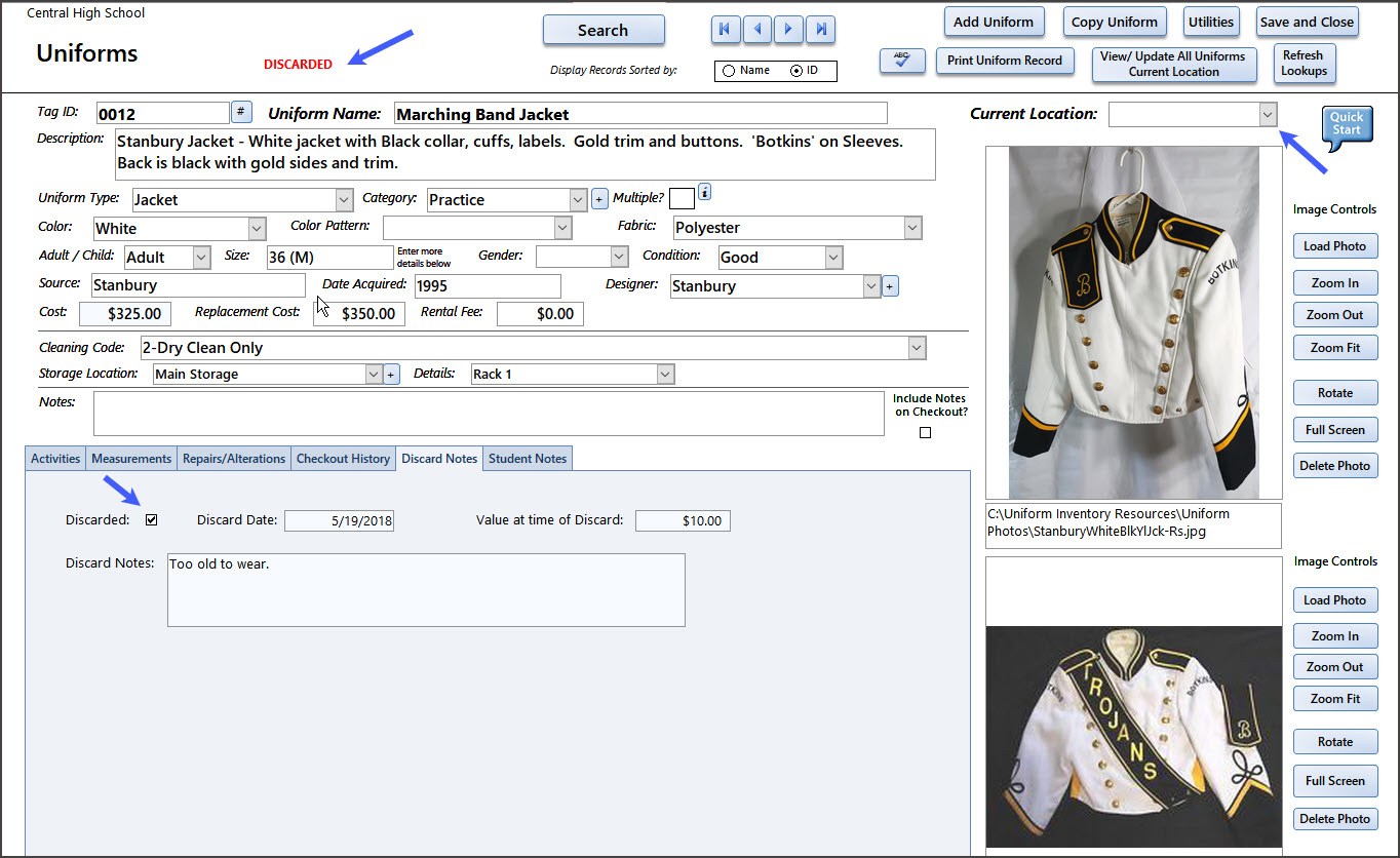 If a uniform is no longer usable but you want to keep a record of who checked it out or how long it was used, you can mark the uniform record as "Discarded". If you need to keep track of the value of the uniform (for the Accounting Office) you can also indicate it's value at the time of the Discard. There is a report for all Discards on the Reports menu. When a uniform is marked as Discarded the Storage Location field is cleared.