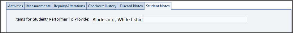 Disposable: Some very low value items - such as stockings or gloves may be something you provide your students but do not want them back after the performance. These items are marked as "Disposable". They can be checked out (so they appear on the checkout receipt) but are not expected to be returned.