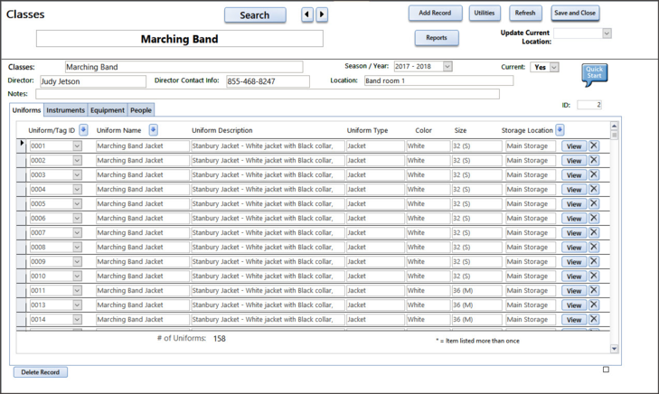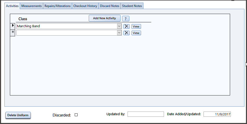 Uniforms, Instruments, Equipment and Students/Performers can be assigned to one or more specific classes or activities. The Classes / Activities tag on the Uniform screen allows you to list one or more Classes/Activities. On the example above this uniform is assigned to the Marching Band Class. More information and several reports available from the Classes/Activities screen.