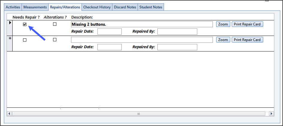 Once the uniform is repaired the check mark can be removed and the "Needs Repair" note at the top of the screen will disappear.