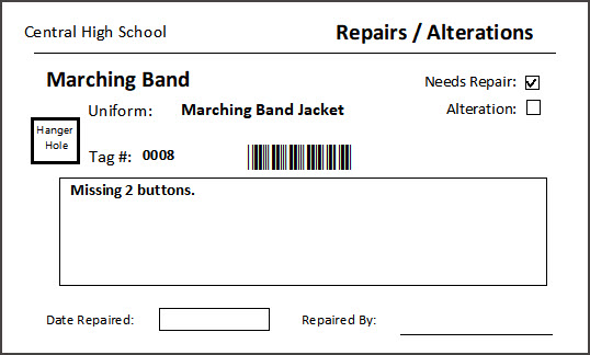 To help the person who is doing the repairs or alterations, you can print out a card with the description of the repairs/alterations needed. The card is designed for a 3" x 5" index card. The card can be pinned to the uniform or placed on the hanger (over the hook).
