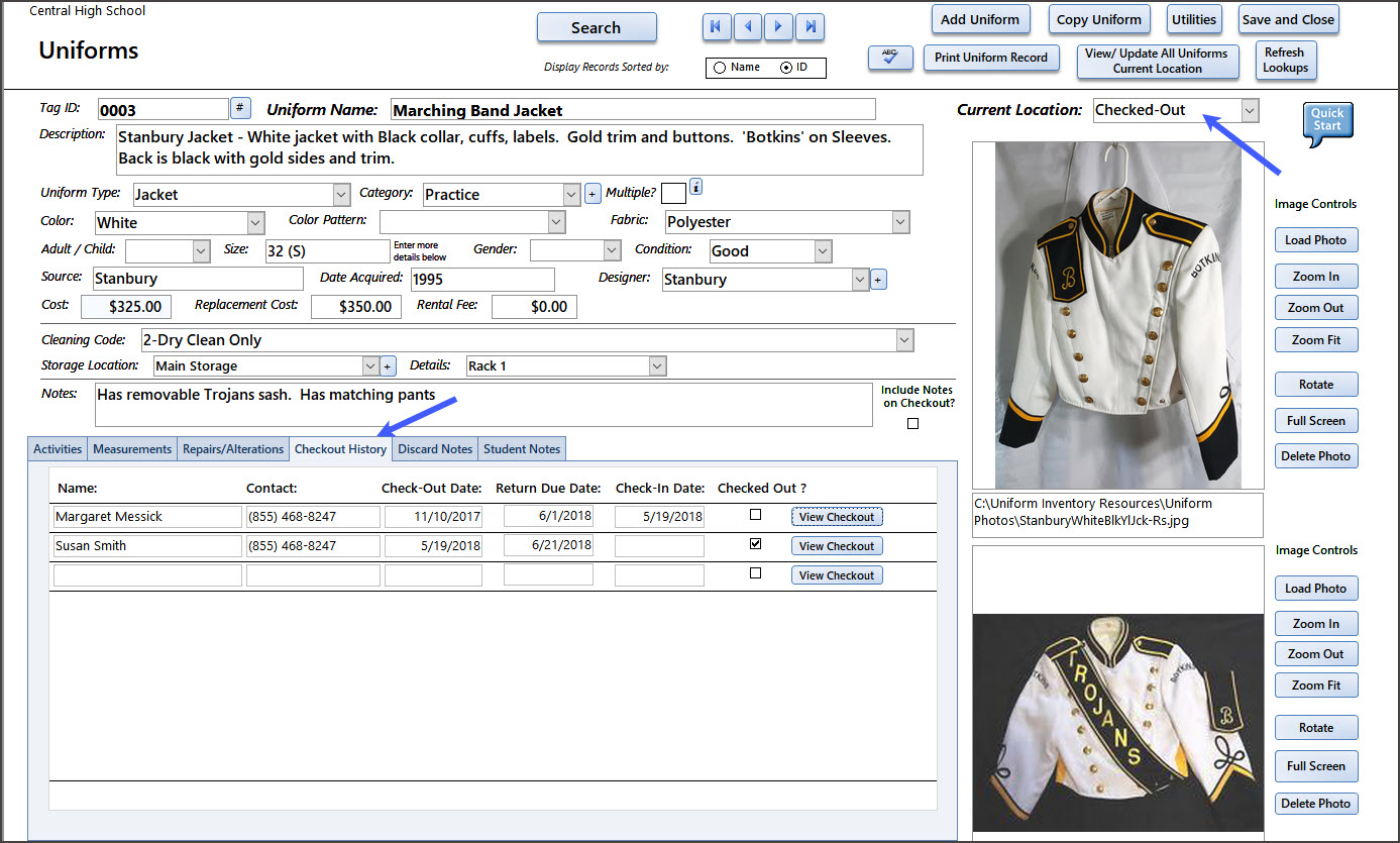 The history of everyone who has checked out this uniform can be seen on the Checkout History tab.