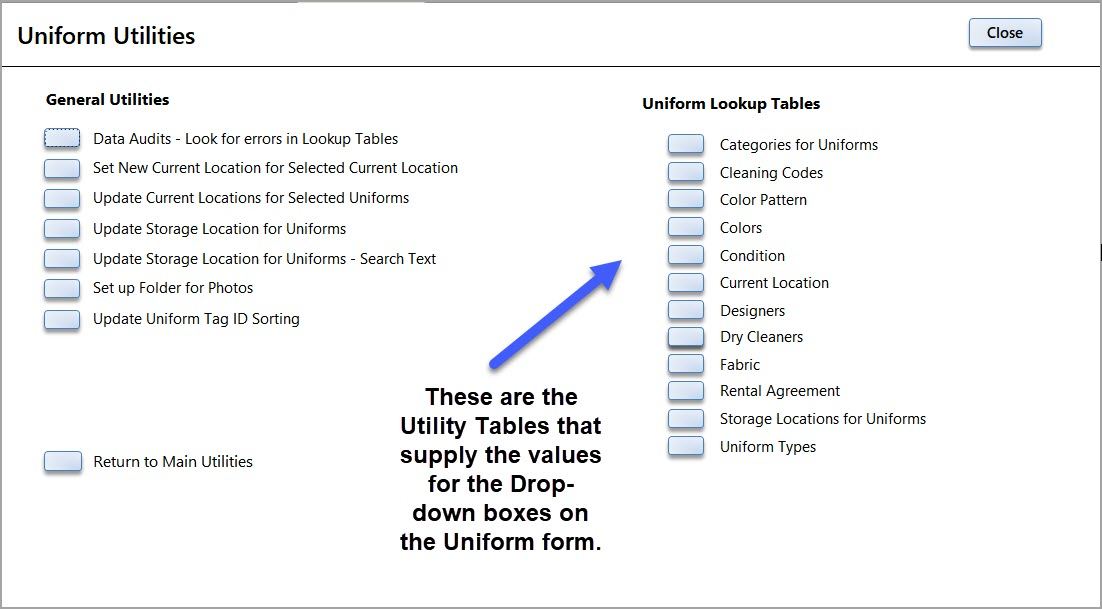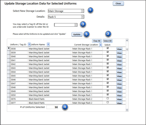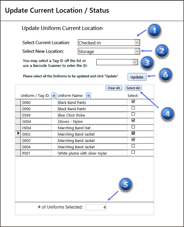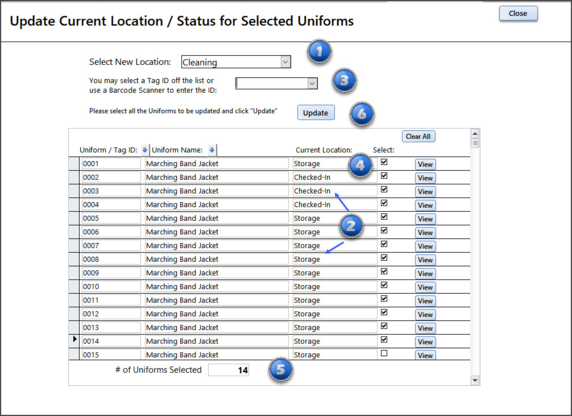 If you have a lot of records that are marked as "Checked In" and want to change them all to "Storage" you can do so with this utility. You can select individual records or select them all to update. When you select a "Current Location" the list of records in the form will show all the Uniform Records for that selected Current Location. You can sort the list using the small blue arrows above the Uniform/Tag ID and Uniform Name fields.