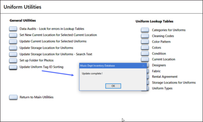 The Uniform records are sorted by Tag ID but as Uniform records are added, deleted or the Tag ID is changed - sometimes the table of Uniform records needs to be re-sorted. If you find that using the Next or Previous buttons on the Uniform screen is not moving the records correctly in Tag ID order, then it is a good idea to re-sort the data. This function only takes a few minutes. When it is done you will see this message: