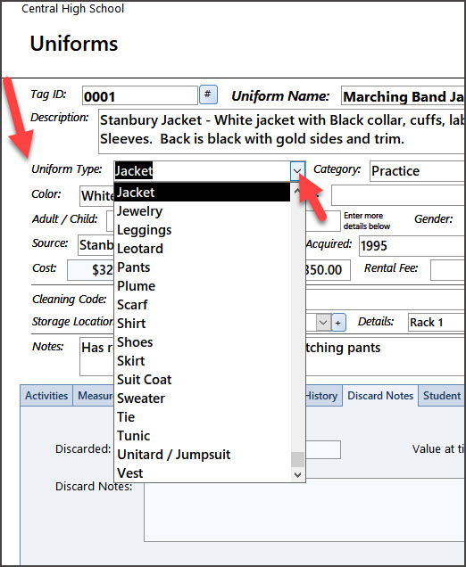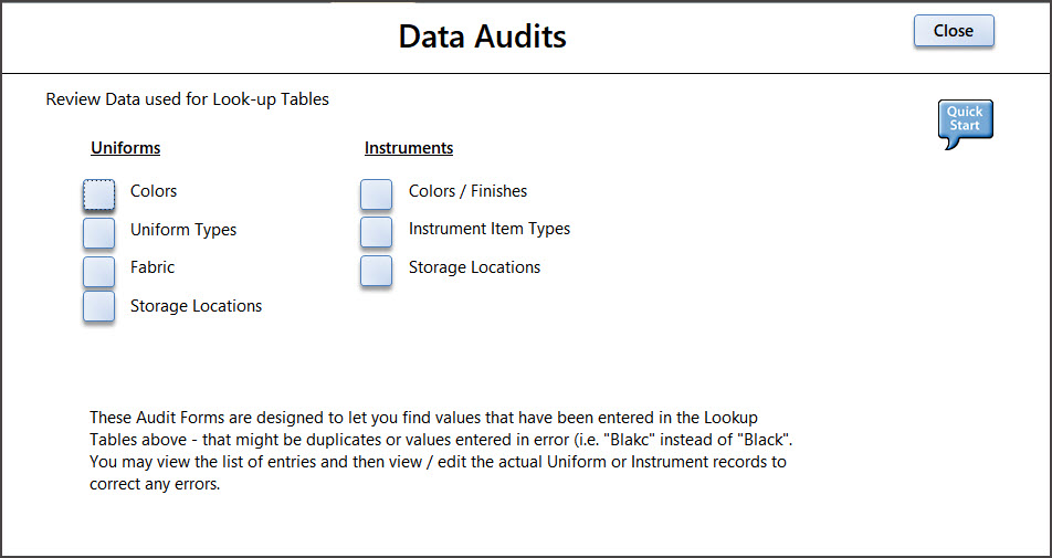 The Data Audit tables will show you the list of Colors, Uniform Types, Fabric and Storage Locations for uniforms and show how many records have selected specific values. For example: If you know you have 15 white jackets made by Fruhauf but when you do a search for "Jackets" and "White" and "Fruhauf" only 12 come up. Where are the other 3 records?