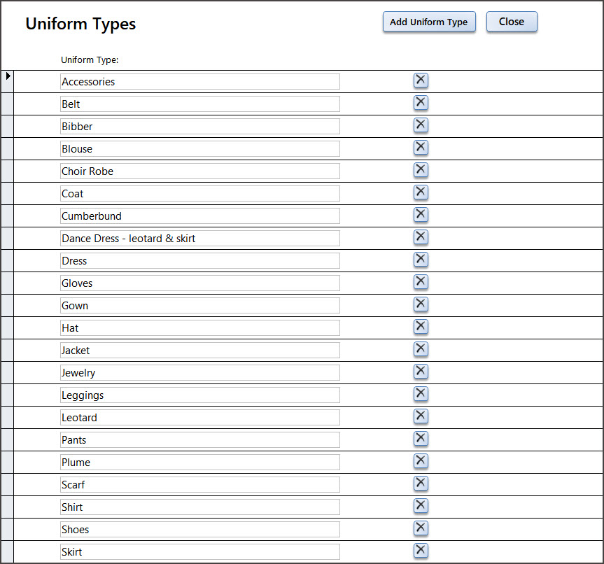 For example: the Uniform Types form is below. To add a new uniform type, click on the "Add Uniform Type" button. You will be taken to a blank record at the bottom of the list. Once you Close the form the table will re-sort in alphabetical order.