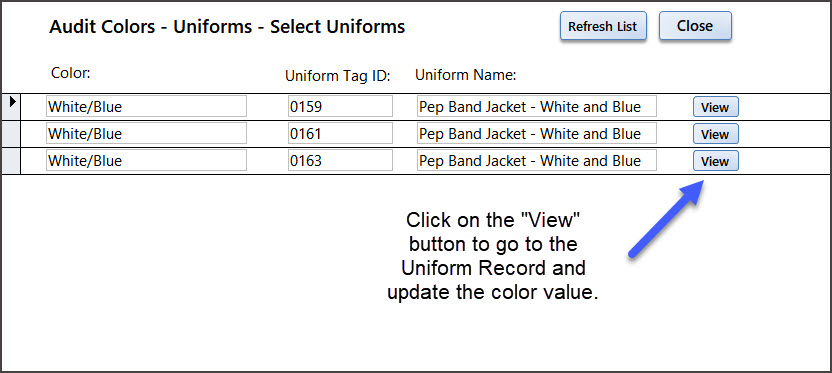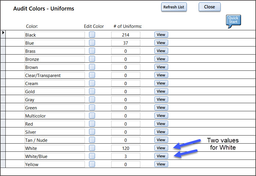 When you do an audit by color you can see the list of colors and how many uniform records there are for each color. There are many records with the color value of "White" but there are also 3 records for "White/Blue". If you click on the "View" button you will see the records that have a color value of "White/Blue".