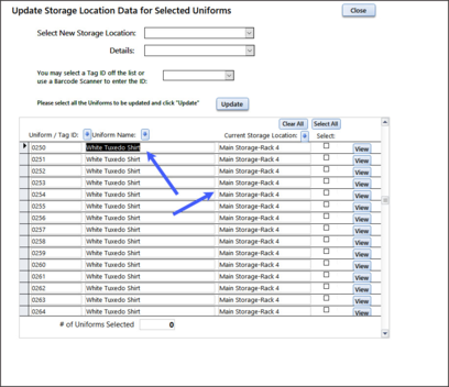 If you have assigned a group of uniforms to one storage location and now want to move them to a new location - you can update the Storage Location value with this utility. When you open this form all the Uniform records will be listed. You will select the ones you want to update. You can sort the list using the small blue arrows above the Uniform/Tag ID, Uniform Name and Storage Location fields.