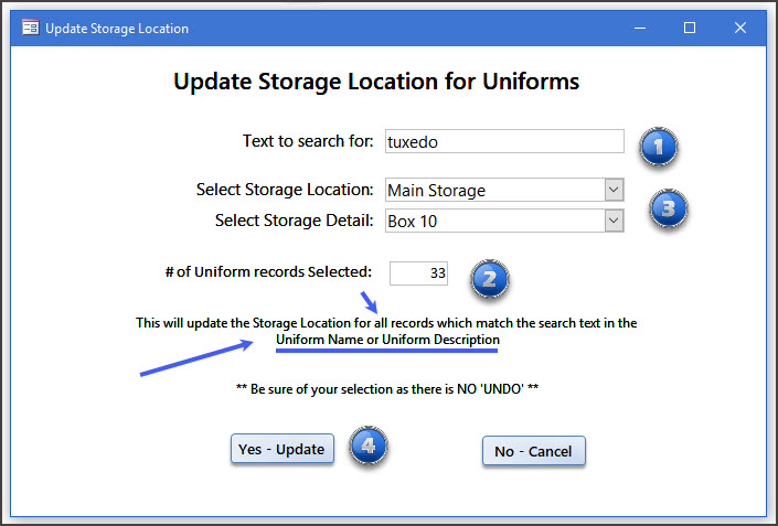 You can see that there are many records with the word "Tuxedo" in the Uniform name. If you want to search for just those records by the word "tuxedo" can change their storage location you can do that with this utility.