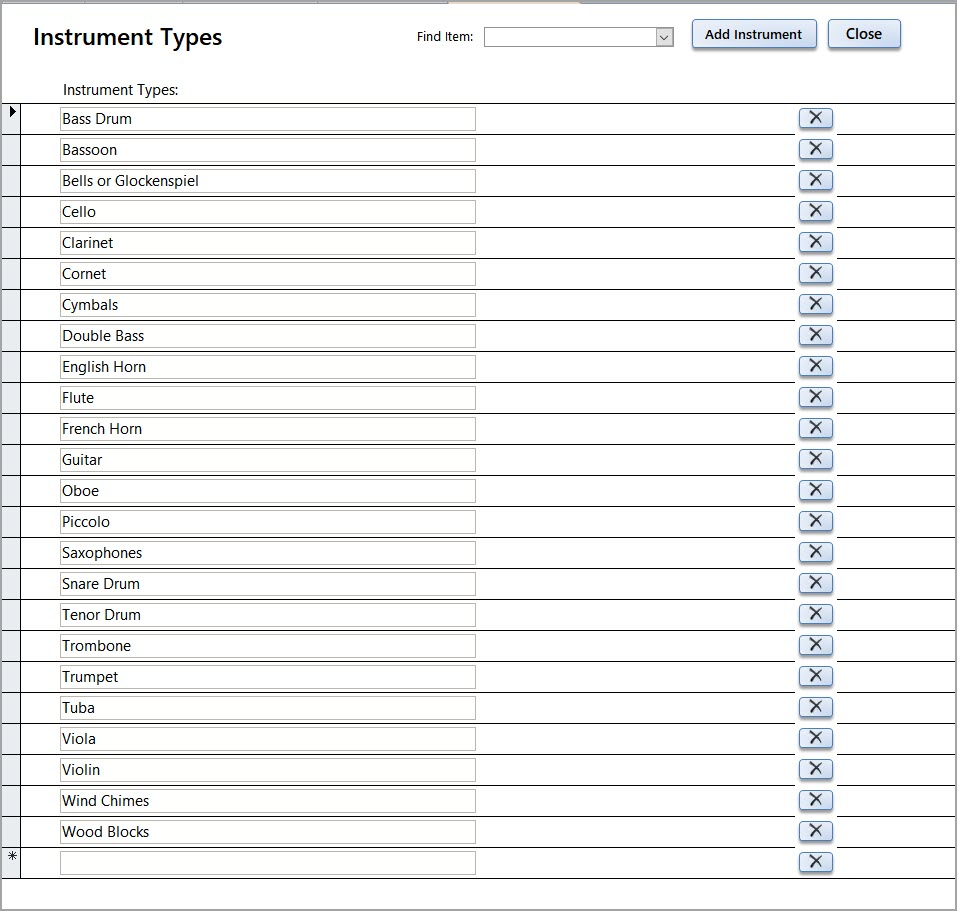 For example - The Instrument Types. You can add / edit or delete ("X") any instrument type from this list. When you go back to the Instruments form be sure to click on the "Refresh Lookups" button to refresh the data in the drop-down box.
