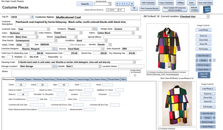 Costume Type - this field helps you categorize the costumes by type - Dress, Coat, Pants, Tutu, Vest, etc. This is very helpful if you want to search for all the “red vests” you have. Additional Costume Types can be added on the Utilities screen.