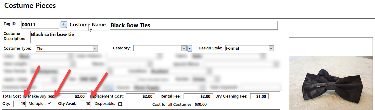 Most items in the Costume Inventory are quite valuable and have an individual inventory tag ID. But some items like ties or gloves or other small items are not worth tagging individually but are still checked out to students/performers and need to be tracked.