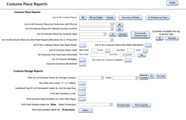 The Costume Piece reports are easy to use. Click on the button or make a selection from the drop down box to view the report in print preview.