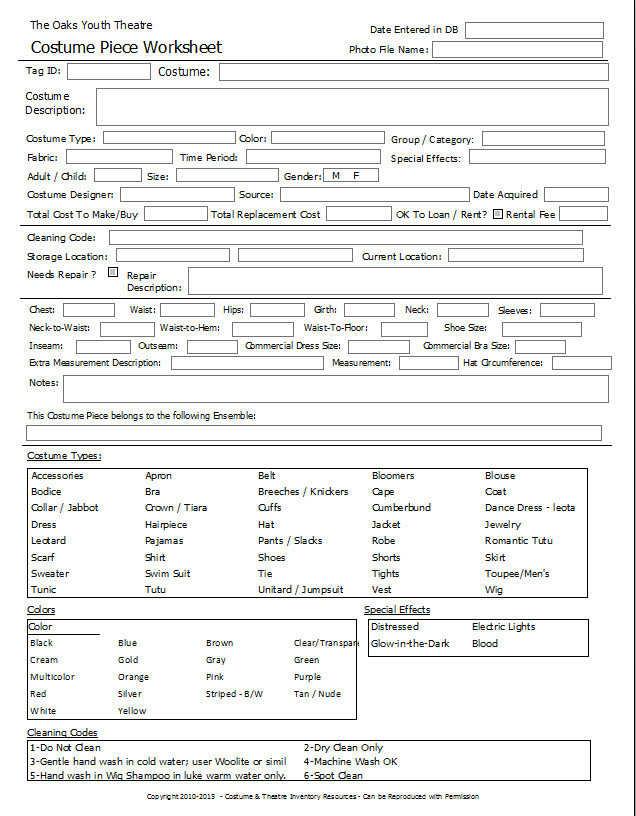 Costume Inventory Worksheet: This is a worksheet you can print to give to volunteers to inventory your costumes before the data is entered in the computer. Feel free to print as many copies as you like. It is a good way to utilize a large number of volunteers when you have only one computer. Once the worksheets are filled out one person can enter the data into the inventory database. Note the lookup tables for Costume Types, Color, Special Effects and Cleaning Codes print the values that are in your database. You may update this list before printing the copies for your crew.