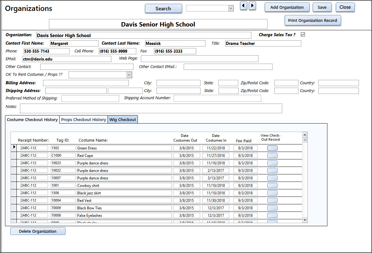 The Organization record is to store information on Organizations (Schools, Theatres, Churches, etc) who want to rent your Costumes, Wigs and Props.