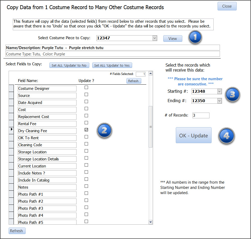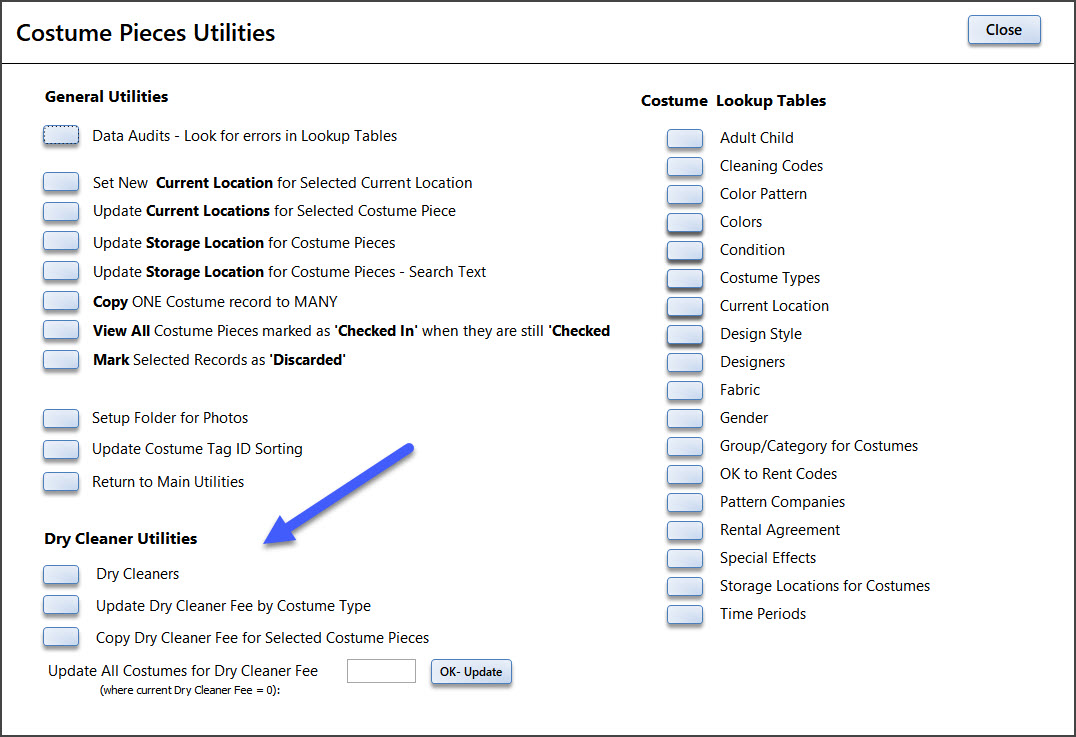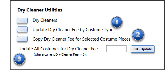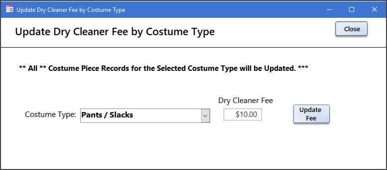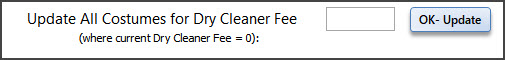 Enter the fee and click "OK-Update". All costume records that have no Dry Cleaner Fee will be updated.