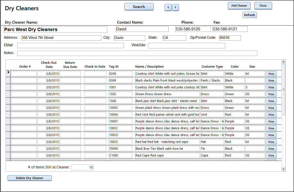 2) On the Dry Cleaners screen enter the cleaner name and contact info. Once you have sent things to the cleaner the list of costumes will show on the screen.