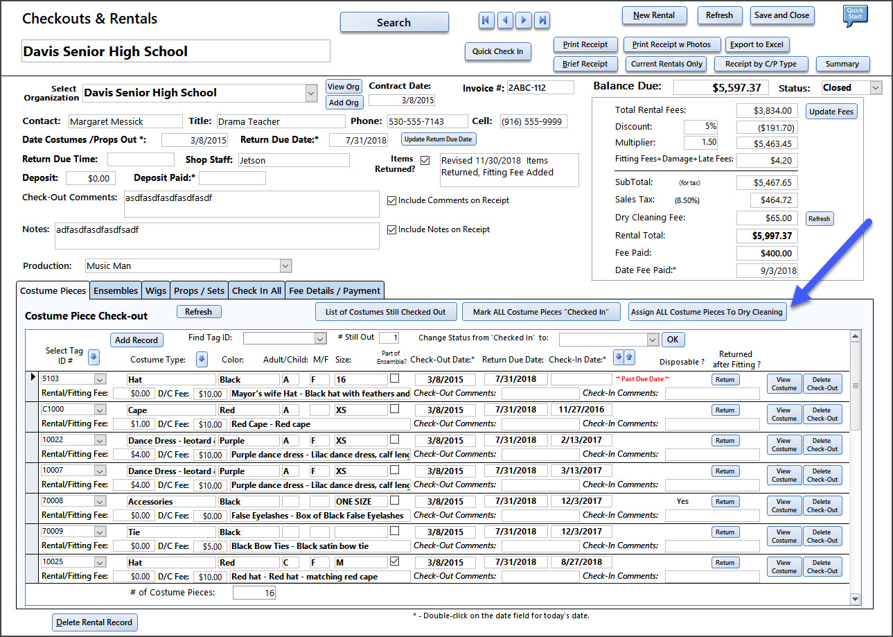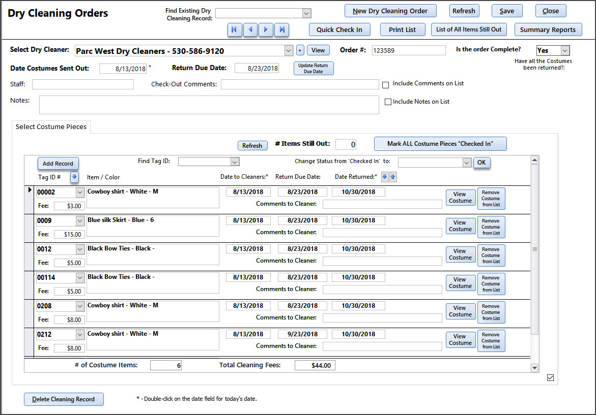 Assign All Costumes to Dry Cleaning record: From the Checkout/Rental screens you can assign/send all RETURNED costumes to the Dry Cleaner. If an item has not been checked in it will not be added to the Dry Cleaning record.