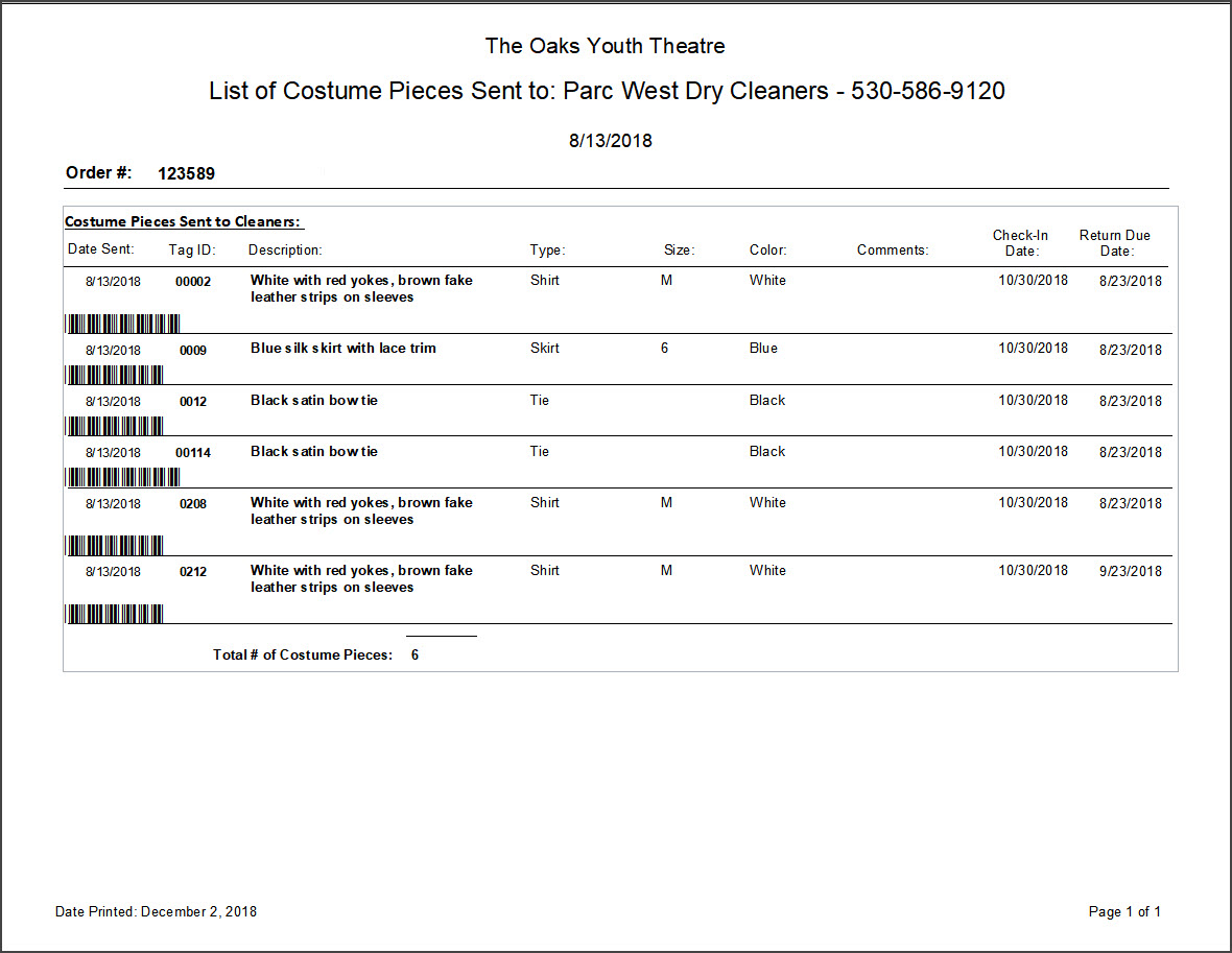 6) To Check In costumes when they come from the cleaner: