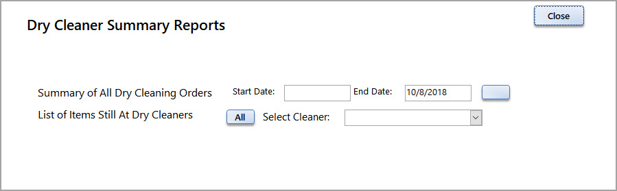 From the Summary Report menu you can select to print a few summary reports of all items sent to the cleaners or just the items that are still at the cleaners.