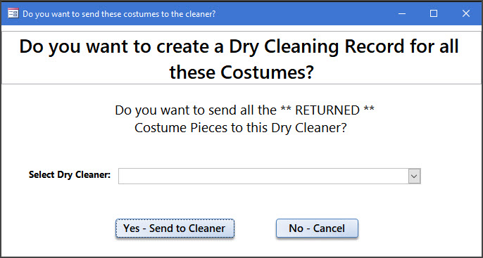 By clicking on the "Assign All Costume Pieces to Dry Cleaning" you will get this dialog. You can select the name of the cleaner and a Dry Cleaning record will be created.