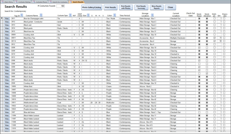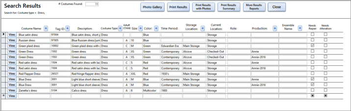 The criteria used (i.e. Costume Type = "Coat") is listed below the screen title. If it is blank then all records were selected.
